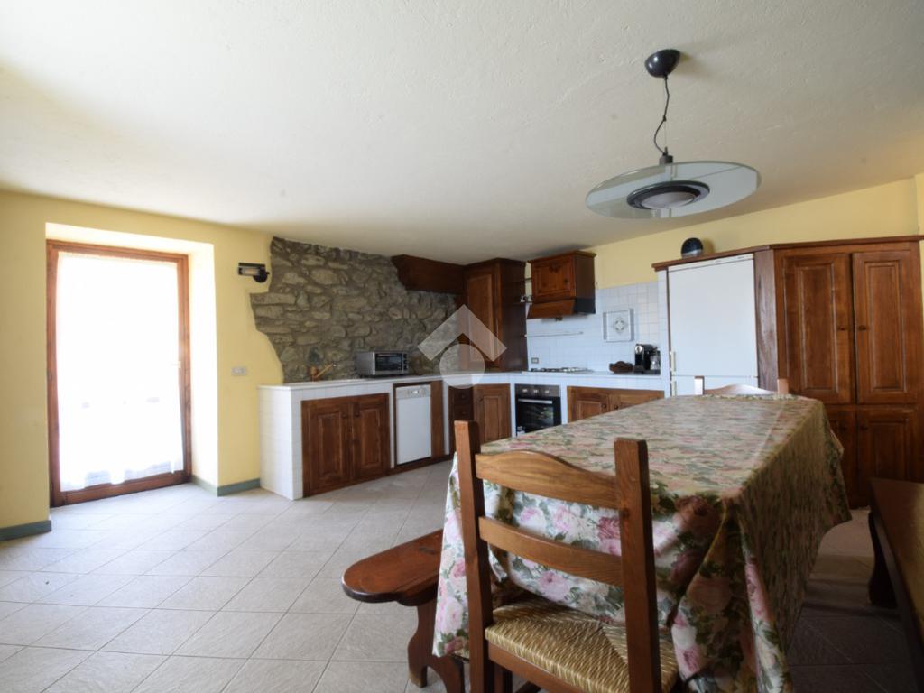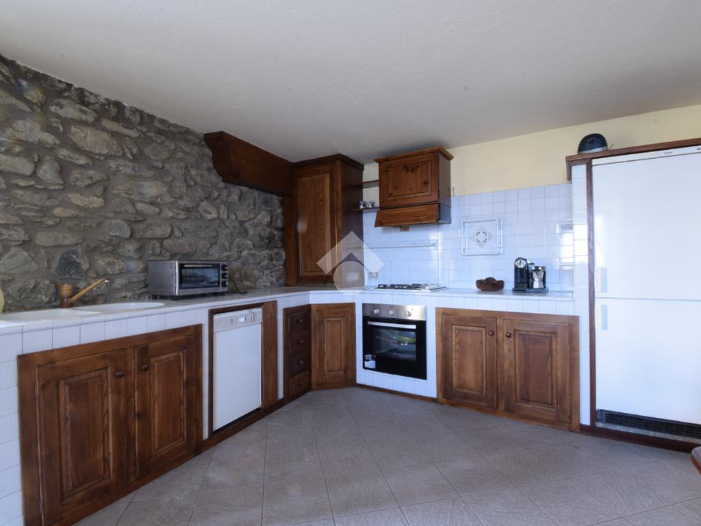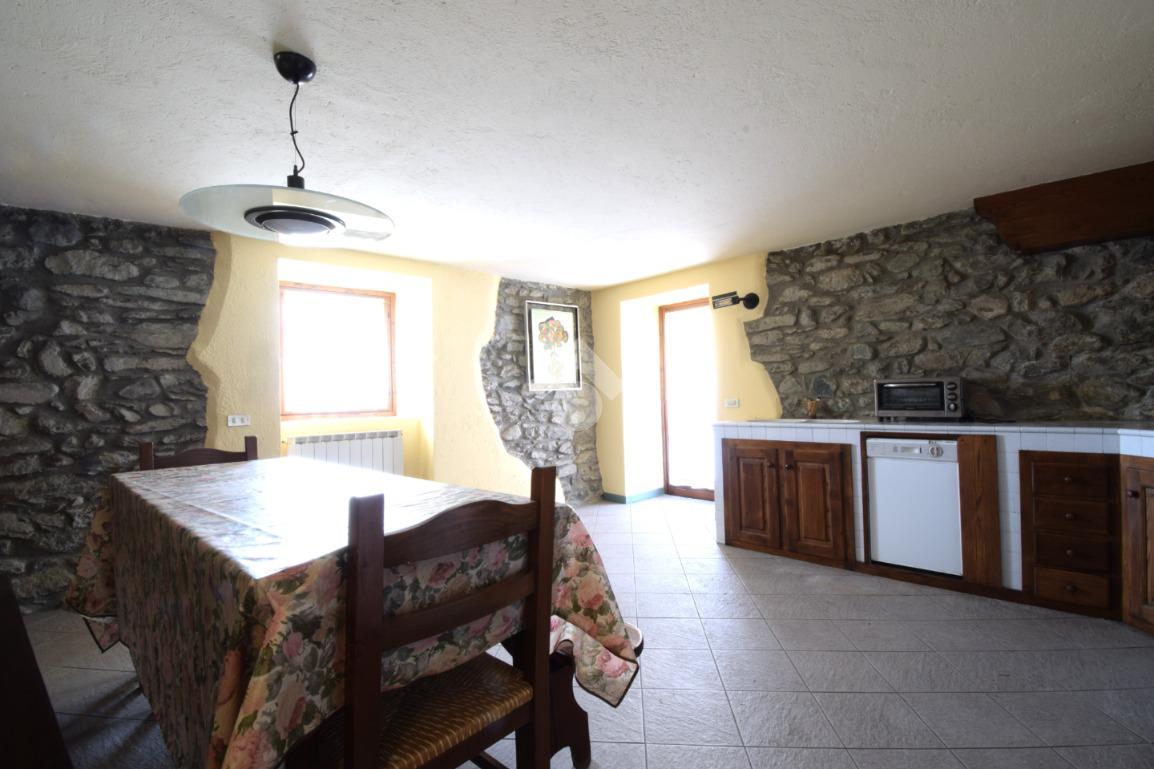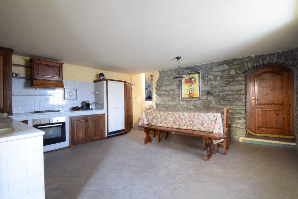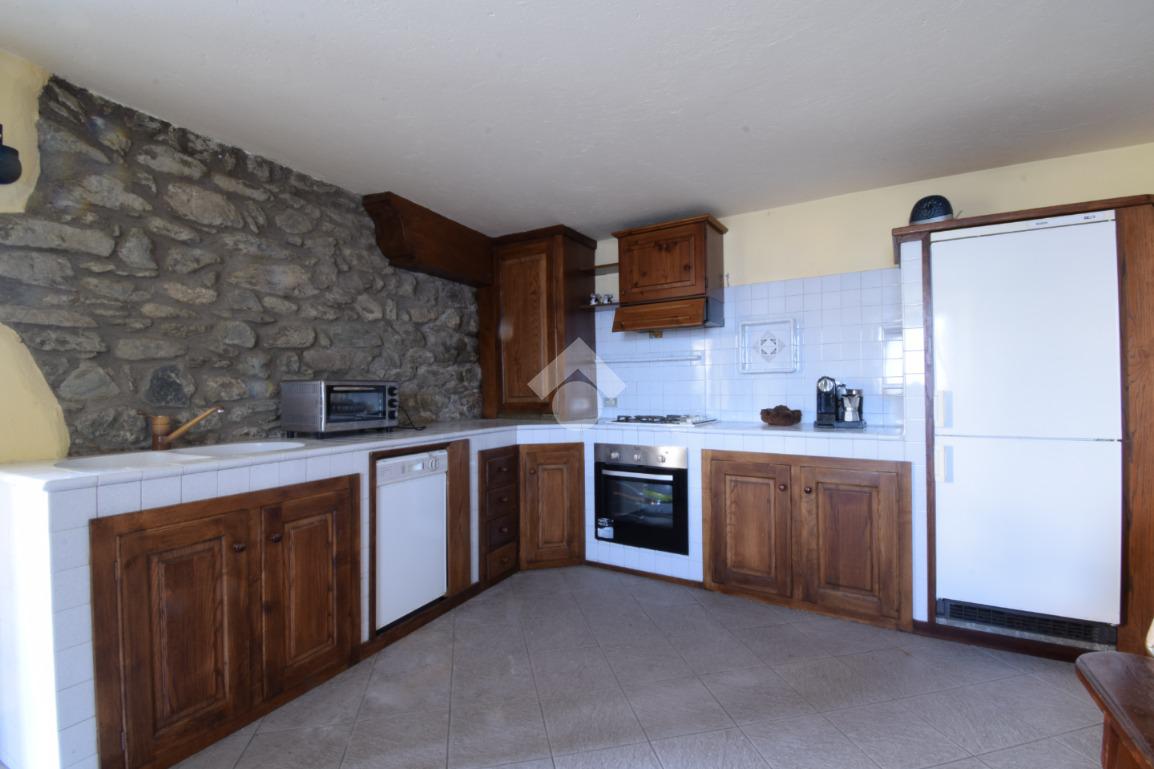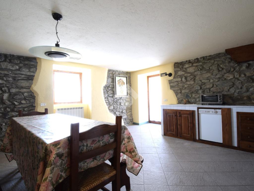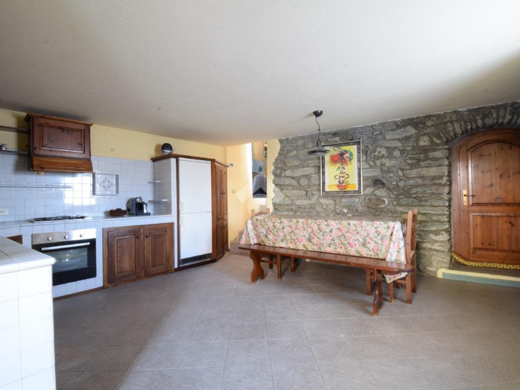 La cucina in muratura è posta al piano terreno ed è spaziosa, ospitando anche un generoso tavolo in legno. Essa gode anche dell'apertura sul balconme esposto a Sud-Ovest con accesso diretto al piacevole cortile. Questo spazio all'aperto è raggiungibile anche dalla rampa di accesso al box auto.